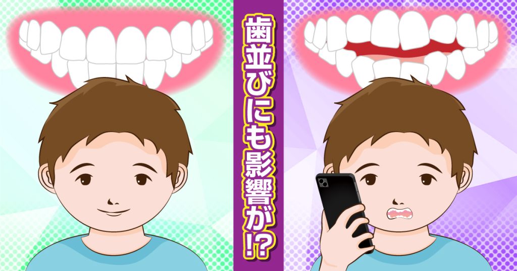 歯並びが悪いと、見た目だけでなく汚れもたまりやすくなるため、お子さんのスマホ利用には十分な注意が必要です。