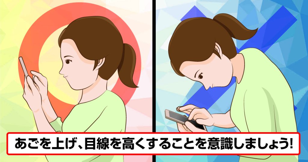 スマホを長時間見過ぎている、という自覚がある方は「あごを上げ、目線を高くする」ことを意識しましょう!