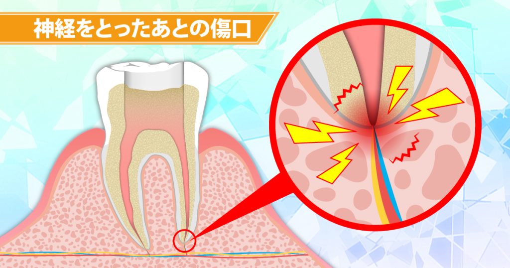 むし歯が進んで神経に達してしまうと、神経をとらなくてはならなくなります。その際、歯の根っこの先端部分で神経を断ち切ることになりますので、その部分が傷口となって痛みが出ることがあります。