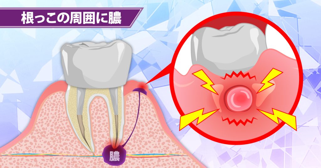 これは、根っこの内部に起きた細菌感染が、徐々に周囲にまで広がり、膿がたまってしまうことが原因です。