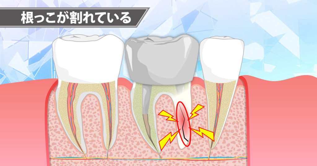 歯の根っこが割れると、その周囲から細菌が入り込み、炎症を起こして痛みが生じます。放置すると周囲の骨がどんどん溶けてしまうので、通常は、早めの抜歯が必要になります。