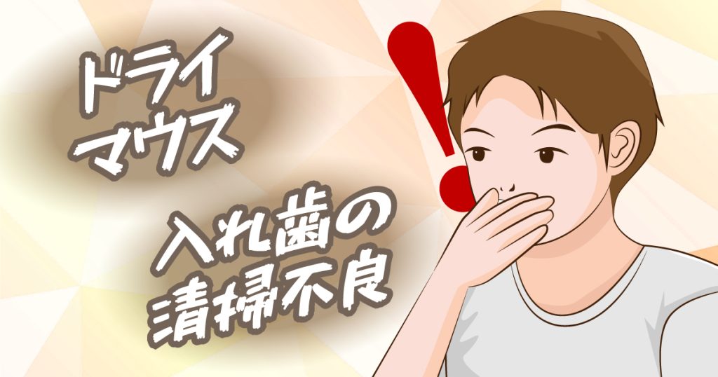 また、家の中のカビと同様に、お口の中が不潔な状態が長く続くと、菌が増殖して口腔カンジダ症を発症しやすくなります。お口の乾燥(ドライマウス)や入れ歯の清掃不良などにも要注意。